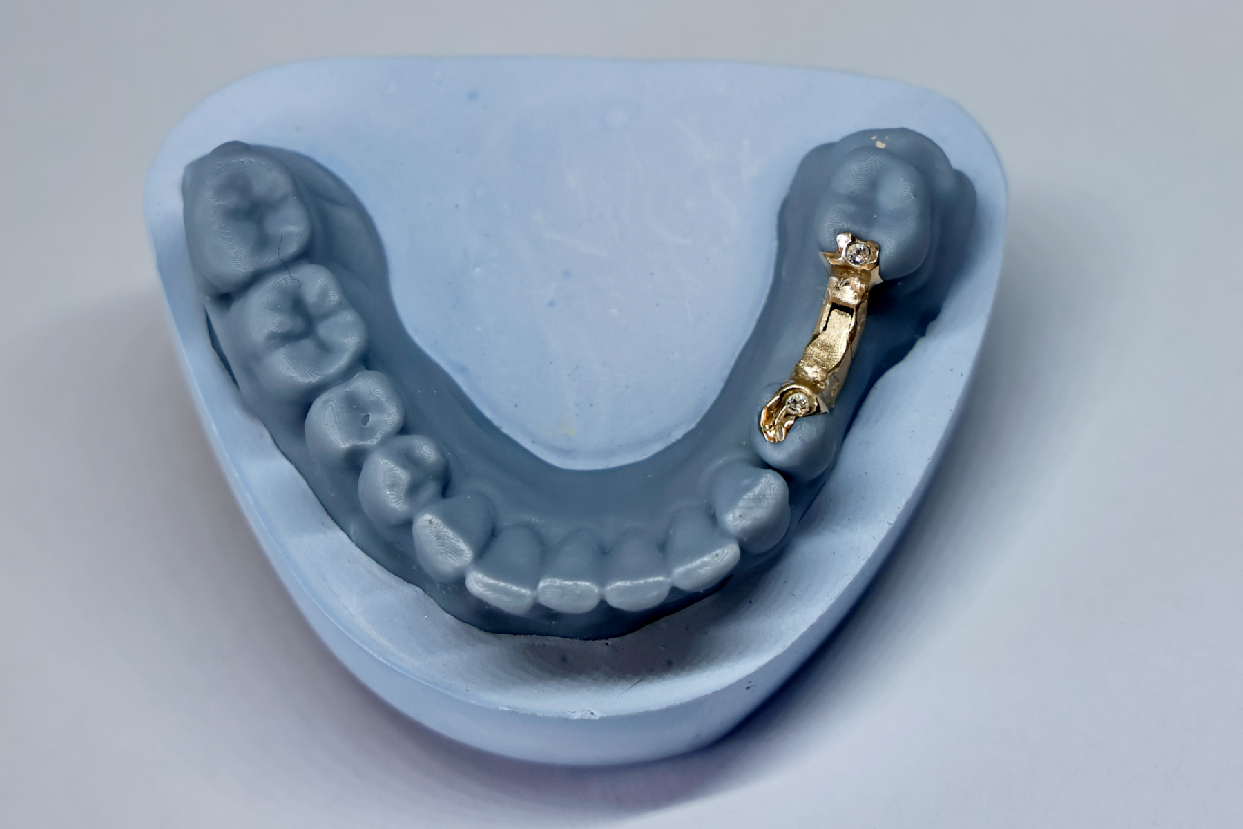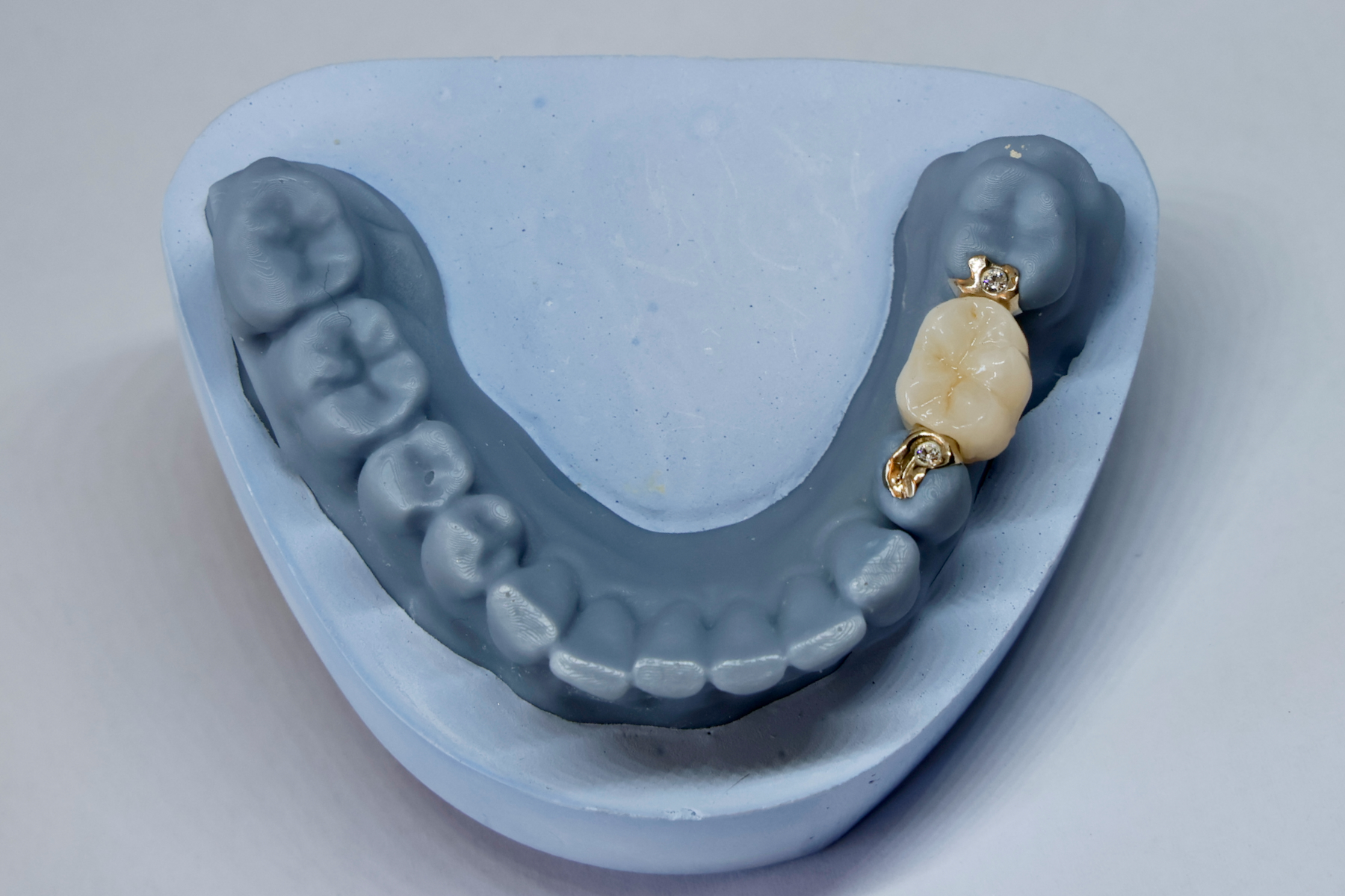 Le bridge 3D Gateway™ peut être réalisé, au choix du praticien, en Zircone, en fibre de verre renforcée ou en céramique hybride. Le pontique ci-dessus, réalisé en or et serti de diamants, confirme la grande variété des matériaux possibles.